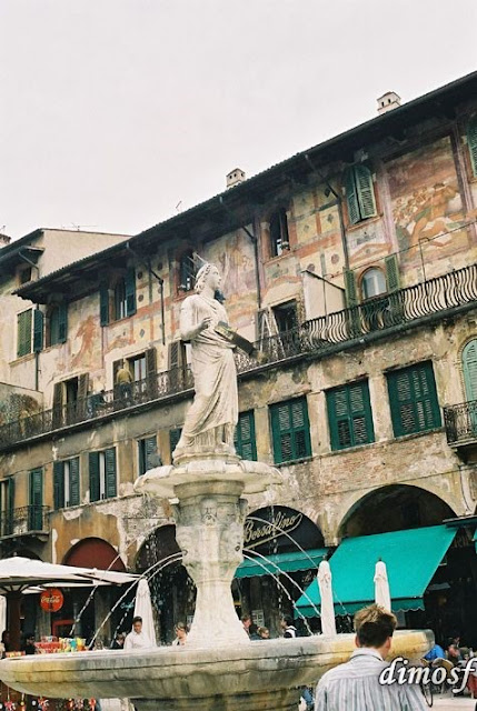 Δεξιά είναι το νεοκλασικό Δημαρχιακό μέγαρο. Στο γραφείο τουρισμού πήραμε έντυπα και χάρτες της πόλης και ξεκινήσαμε. Ακολουθώντας τον πολύ εμπορικό πεζόδρομο Via Mazzini και πριν φτάσουμε στην Piazza delle Erbe, την αρχαία ρωμαϊκή αγορά, καρδιά σήμερα της παλιάς πόλης, κάναμε μια μικρή παράκαμψη προς τα δεξιά να κάνουμε και εμείς το τουριστικό μας καθήκον. Στον αριθμό 27 της Via Cappello είναι ένα πανδοχείο του 13ου αι. Πολύ αργότερα άνοιξαν στον 1ο όροφο ένα παράθυρο με ένα μπαλκόνι και να το σπίτι της Ιουλιέτας (!!!). Μεγάλη απάτη δηλαδή.