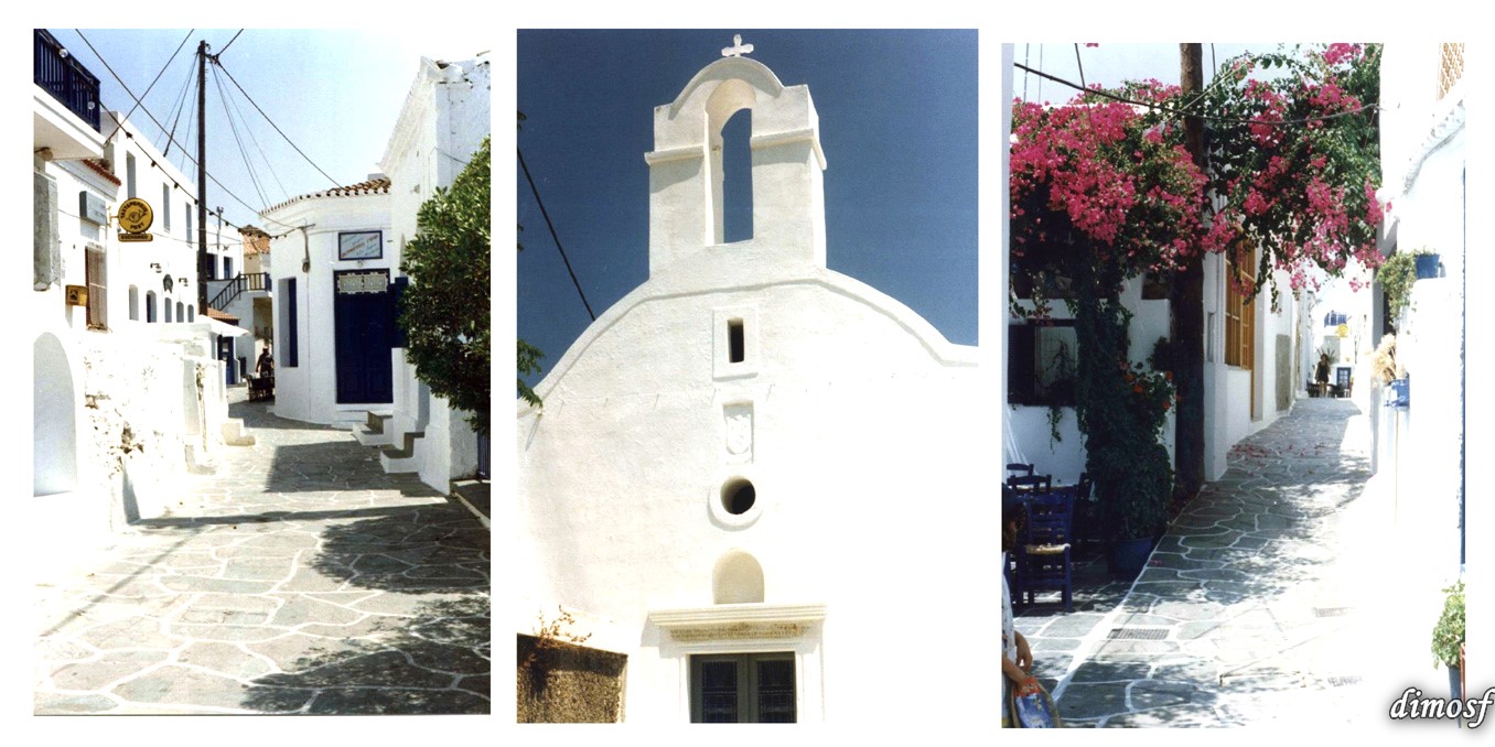 Η μέρα όμως έκλεισε πολύ όμορφα στη Χώρα. Πήγαμε με τους φίλους μας. Είχε βραδιάσει και ήταν πολύ όμορφα. ΚΥΚΛΑΔΕΣ!!!! Άσπρα σπίτια, άσπρα τα καλντερίμια, άσπρα τα σχέδια κάτω σε καλντερίμια και αυλές. Καράβια, ψάρια, λουλούδια, άγκυρες, αλλά και γεωμετρικά σχέδια. Η λαϊκή τέχνη στο χώρο της και με όλη της την ομορφιά!! Και φυσικά η πάστρα και η καθαριότητα που «μοσκοβολούσαν». Η νυχτερινή εικόνα της Χώρας μας ενθουσίασε. Είχε αρκετό κόσμο αλλά δεν ήταν η κοσμοπλημύρα άλλων τουριστικών τόπων, και γι αυτό και δεν ενοχλούσε. Κάτσαμε να τσιμπήσουμε κάτι και το βράδυ μας έκλεισε με παγωτό στον ΚΟΥΡΣΑΡΟ!