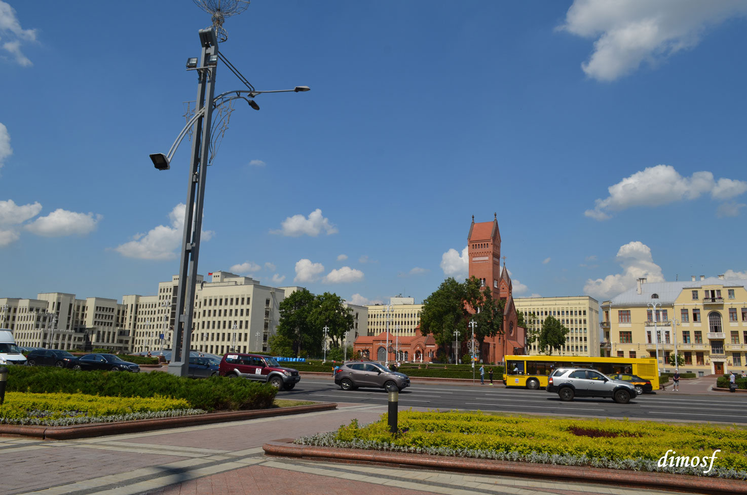 Στην πλατεία Ανεξαρτησίας, την κεντρική πλατεία του Μινσκ, της πρωτεύουσας της Λευκορωσίας, υπάρχουν εκτός των άλλων ο Καθολικός Ναός των Αγίων Σίμωνα και Άννας (φτιαγμένος από κόκκινο τούβλο) και αριστερά του αυτό το τεράστιο λευκό κτίριο, που είναι η έδρα της κυβέρνησης.